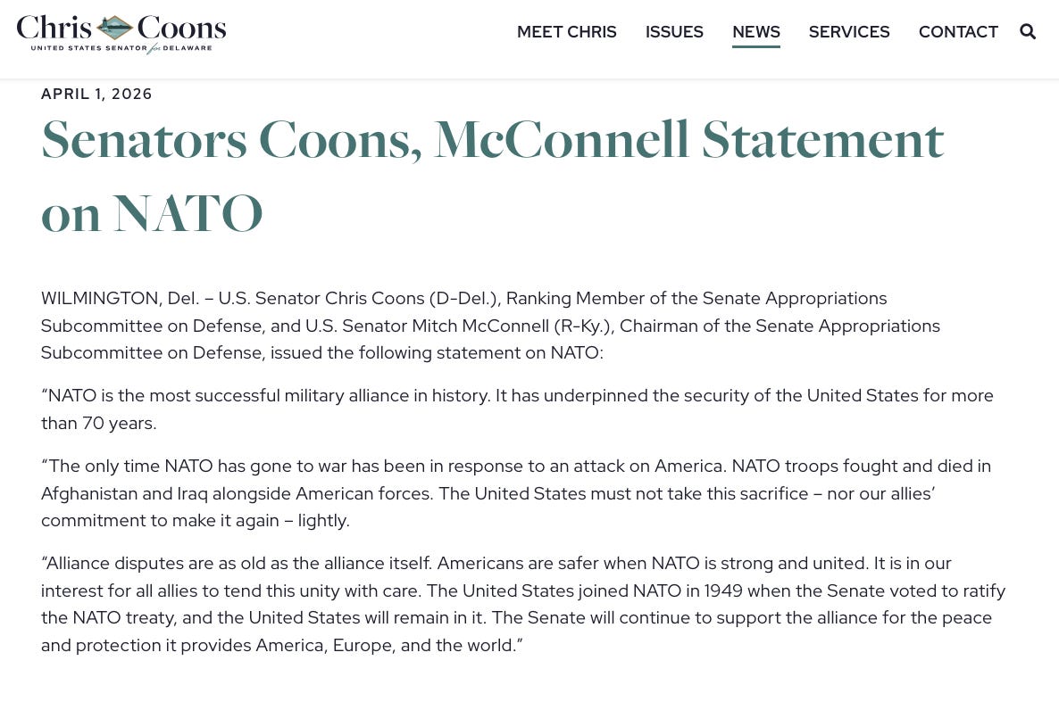 ICYMI — Coons, McConnell Statement on NATO (4-1-2026)